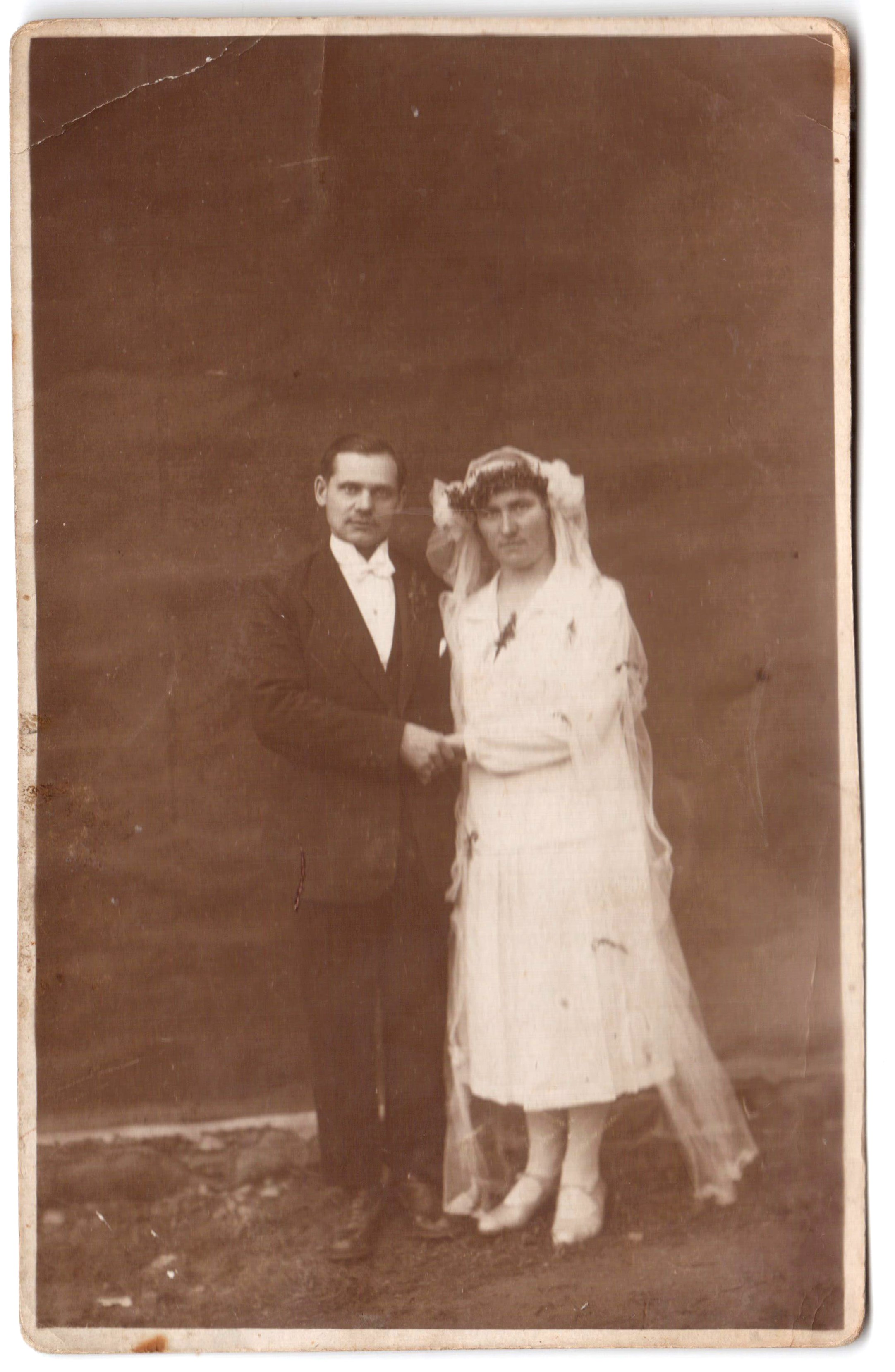 Jaunlaulātie savā kāzu dienā 20. gs. 30-tajos gados.