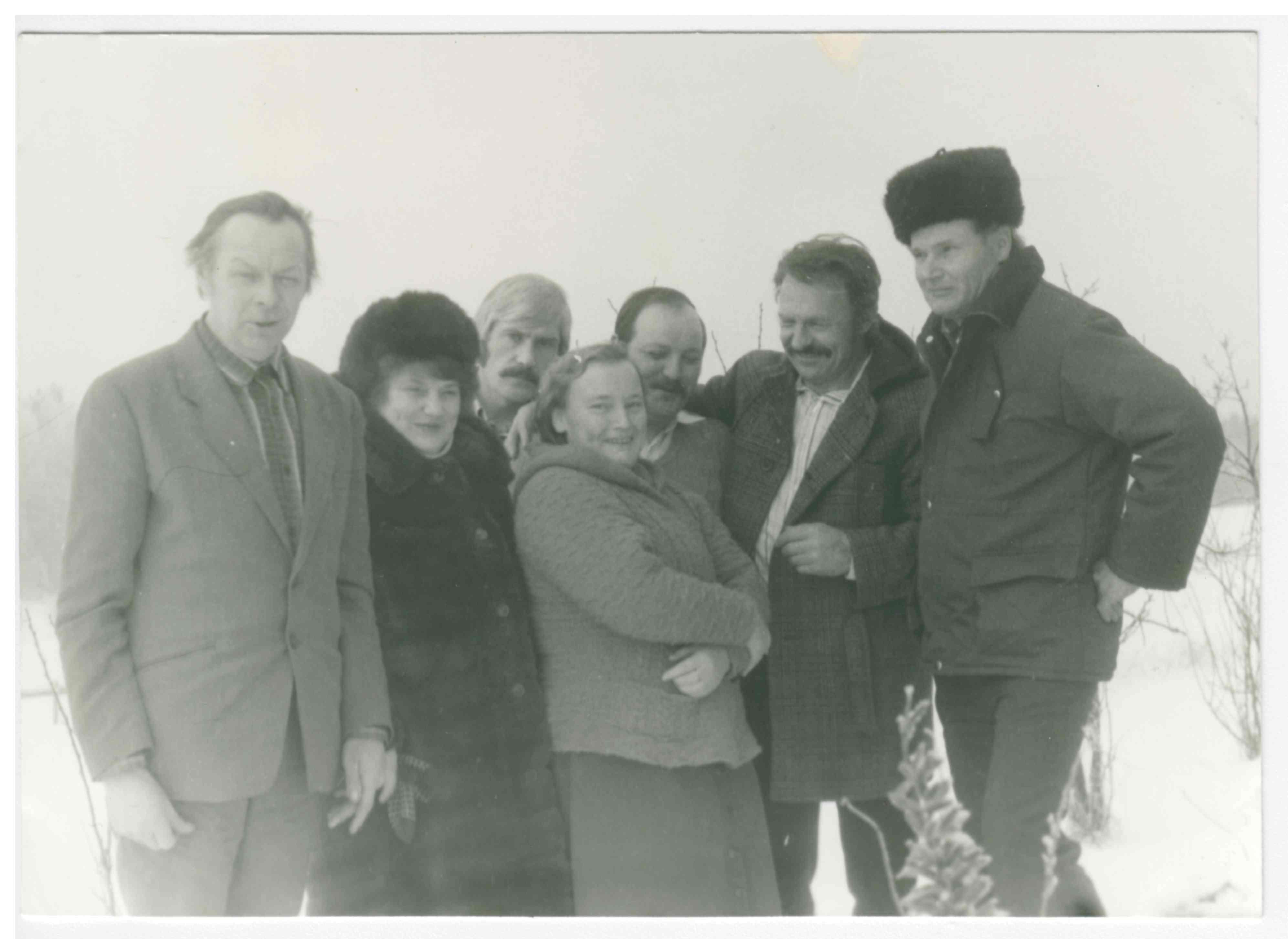 Pulciņš kalnieniešu viesojas pie Gulbenes rajona kolhoza "Kalniena" mehānisko darbnīcu vadītāja Virgīlija Slucka. Svinības par godu jurģiem - V. Slucka ģimenei kolhozs ierādījis jaunu dzīvesvietu, jaunuzcelto Līvānu būves tipa māju. No kreisās: Tālivaldis Krilovs, nezināma, Andrejs Zožs, Benita Zaķe, Māris Bērziņš, Virgīlijs Sluckis, Zigons Zaķis.