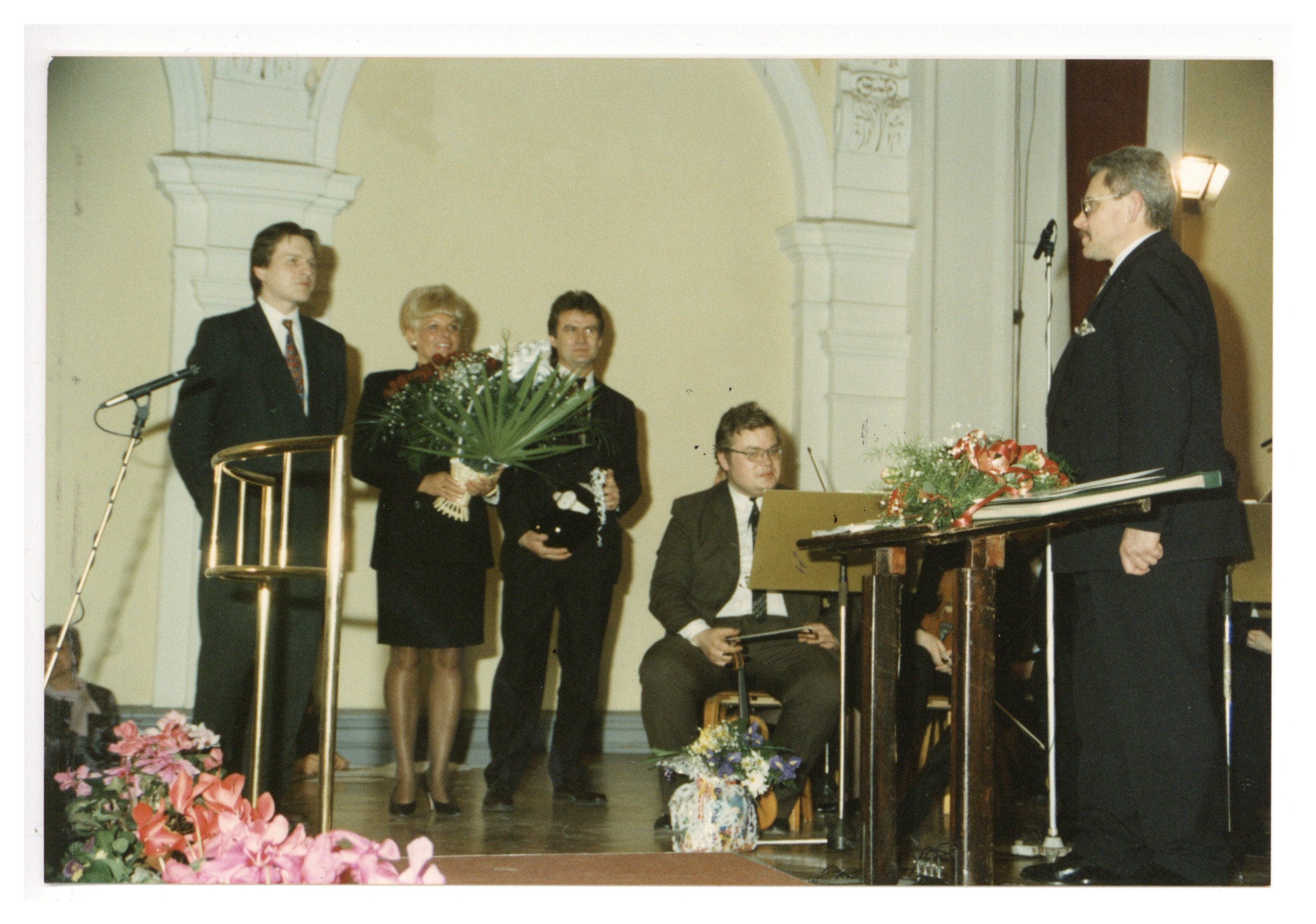No kreisās puses: 1. Gints Kārkliņš, 2. Mārīte Baloda, 3. nezināms, 4. Jurijs Savkins (sēž), 5. Juris Karlsons.