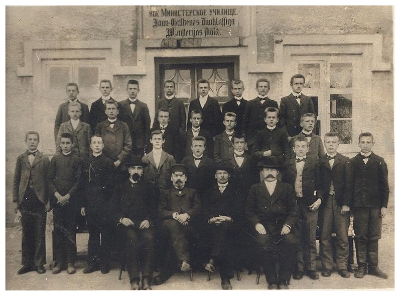 Pirmajā rindā no kreisās puses: skolas pārzinis Jānis Māliņš, E.Kanaviņš, ceturtais - P.Alberts.