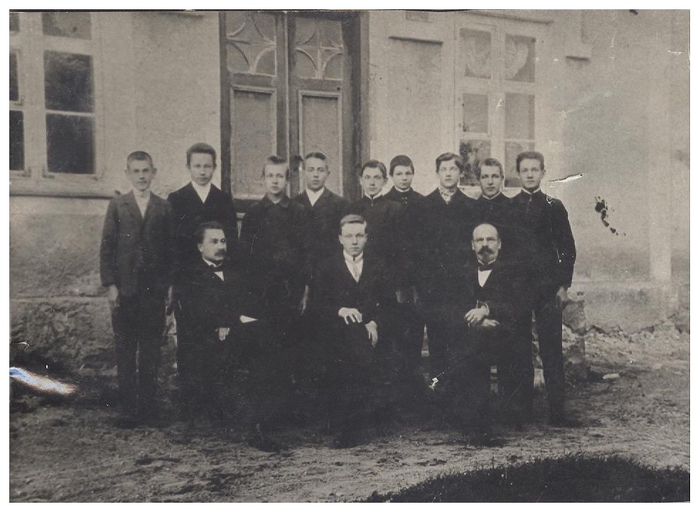 Pirmajā rindā no kreisās skolotāji: Jānis Galiņš, Ernests Kanaviņš.