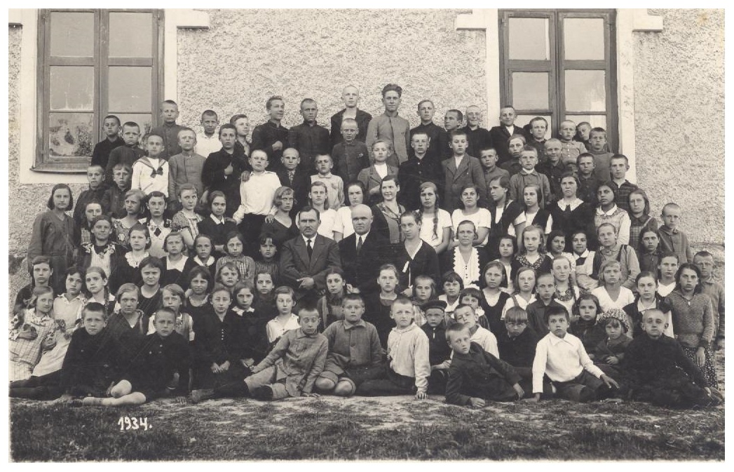 Vidū skolotāji no kreisās puses: skolas pārzinis P.Mednis, Jānis Dukmanis, M.Dukmane, Poiša pie skolas. Ar šādu nosaukumu skola pastāvēja no 1921.gada līdz 1941.gadam.