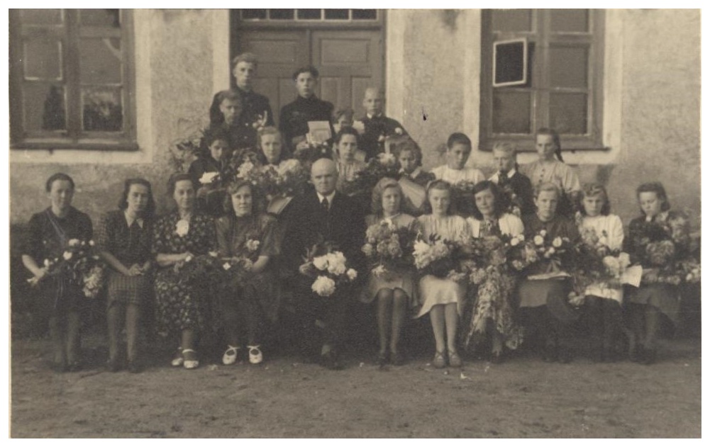 1947./1948.mācību gada absolventi un skolotāji pie skolas. Pirmajā rindā no kreisās puses: klases audzinātāja Austra Upmane, skolotāji Guna Eglīte, M.Dukmene, E.Augustāne, direktors Jānis Dukmanis, B.Zaļā, Elga Deksne, Vanda Opse, Ausma Krieviņa, Otvare, Vija Kluce.