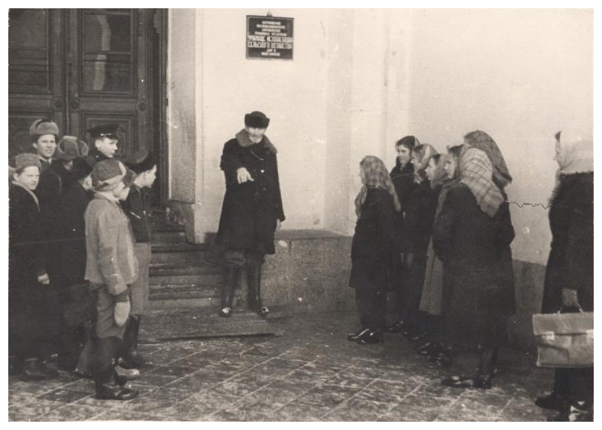 1905. gadā Līgo ciemā izveidotās revolucionāru grupas vadītājs Ernests Vītols ar skolēniem pie Jaungulbenes pils, kur soda ekspedīcija sodījusi revolucionārus ar pēršanu.