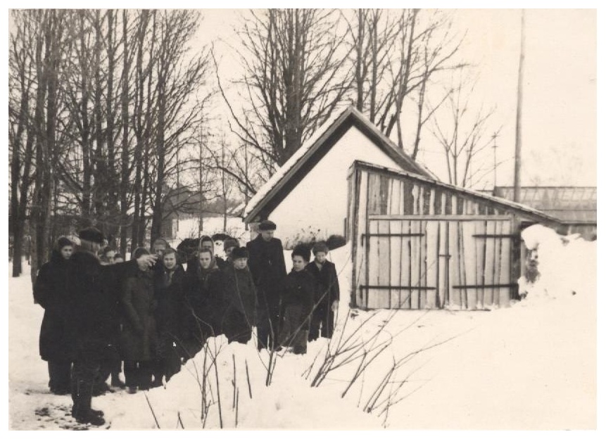 1905. gadā Līgo ciemā izveidotās revolucionāru grupas vadītājs Ernests Vītols ar skolēniem pie vietas, kur draugi viņu izglāba no soda ekspedīcijas dalībnieku plānotās izrēķināšanās.