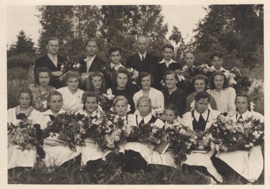 1955./1956.mācību gada absolventi un skolotāji. Pirmā rindā no kreisās puses: Zenta Svarāne, Edīte Jukāma, Irēna Poiša, Antra Kalniņa, Vera Misiņa, Anita Ērgle, Ruta Kalniņa, Ausma Poiša. Otrā rindā no kreisās puses: skolotāji Guna Eglīte, J.Dirša, Elga Deksne, direktore Ausma Korule, skolotāji Vanda Opse, Konstance Pūpola, Derkina, Saleniece. Trešajā rindā no kreisās puses: Ivars Eglītis, Valdis Elksnītis, Marģeris Šķipsna, skolotājs Francis Strods, Juris Meilerts, Māris Andersons, Paulis Pērkons.