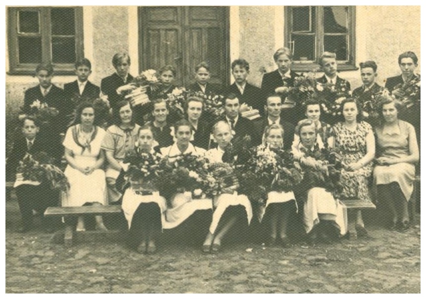 Izlaiduma klases skolēni un skolotāji izlaidumā 1959.gada 13.jūnijā pie skolas.