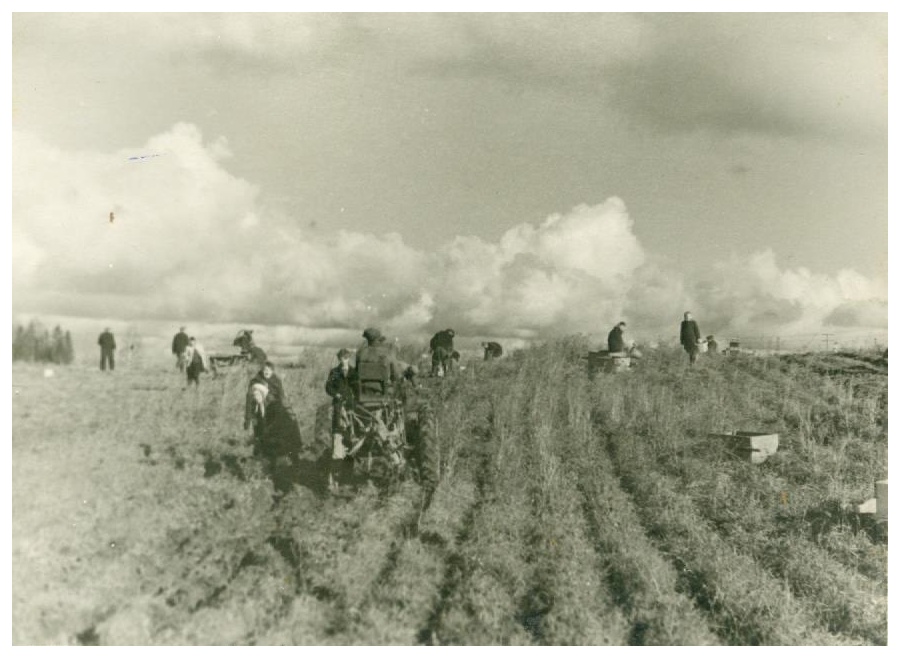 Siltāju astoņgadīgās pamatskolas skolēni un skolotāji kartupeļu novākšanā Līgo ciema kolhozā "Leons Paegle".