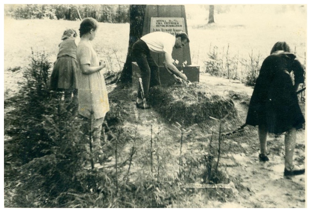 Siltāju astoņgadīgās skolas skolēni Līgo ciema "Strados" pie Almas Veismanes un Henriha Oša piemiņas vietas.