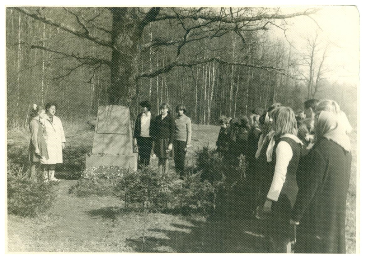 Siltāju astoņgadīgās skolas skolēni Līgo ciema "Strados" pie Almas Veismanes un Henriha Oša piemiņas vietas.