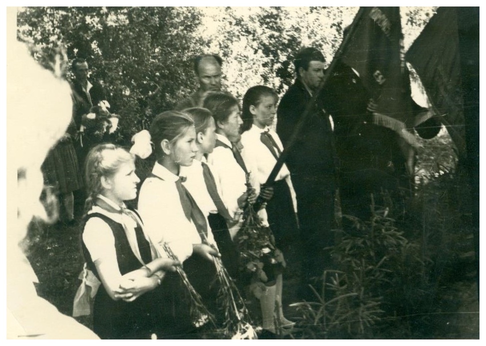 Siltāju astoņgadīgās skolas skolēni Līgo ciema "Strados" pie Almas Veismanes un Henriha Oša piemiņas vietas.