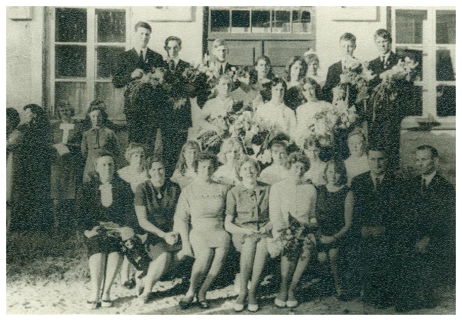 1968./1969.mācību gada absolventi un skolotāji pie skolas. Pirmajā rindā no kreisās puses: skolotāja A.Spinga, skolotāja H.Lapsa, skolas direktore A.Bundziņa, skolotāja Voika, audzinātāja G.Eglīte, skolotāja D.Rudzīte, skolotājs P.Blekte, skolotājs G.Lapss. Otrajā rindā no kreisās puses: I.Kuzāka, L.Lēcone, LGreibere, E.Sausiņa, A.Sausiņa, G.Spinga. Trešajā rindā no kreisās: D.Aizkalne, Z.Krūmiņa, S.Vasilišina, M.Miķīte. Ceturtajā rindā no kreisās puses: M.Kļaviņš, E.Sarkanis, G.Liepiņš, I.Gailīte, I.Gangnuss, J.Bokolders.