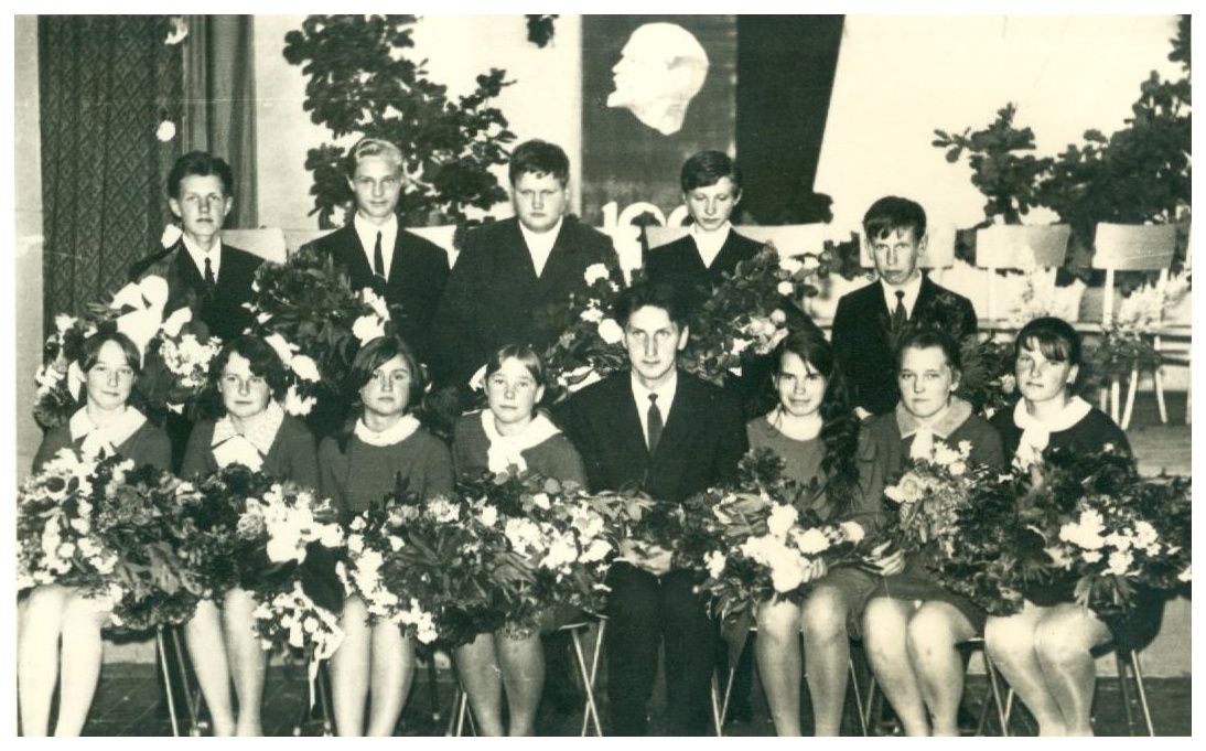 1970./1971.mācību gada absolventi un klases audzinātājs. Pirmajā rindā no kreisās puses: L.Cīrule, M.Kozlovska, I.Kozlovska, A.Sukure, audzinātājs P.Blekte, I.Gabrāna, Dz.Smilga, A.Sausiņa. Otrajā rindā no kreisās puses: M.Aizkalns, T.Stradiņš, J.Grendelis, G.Sroicis, J.Logins.