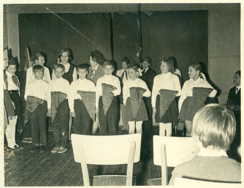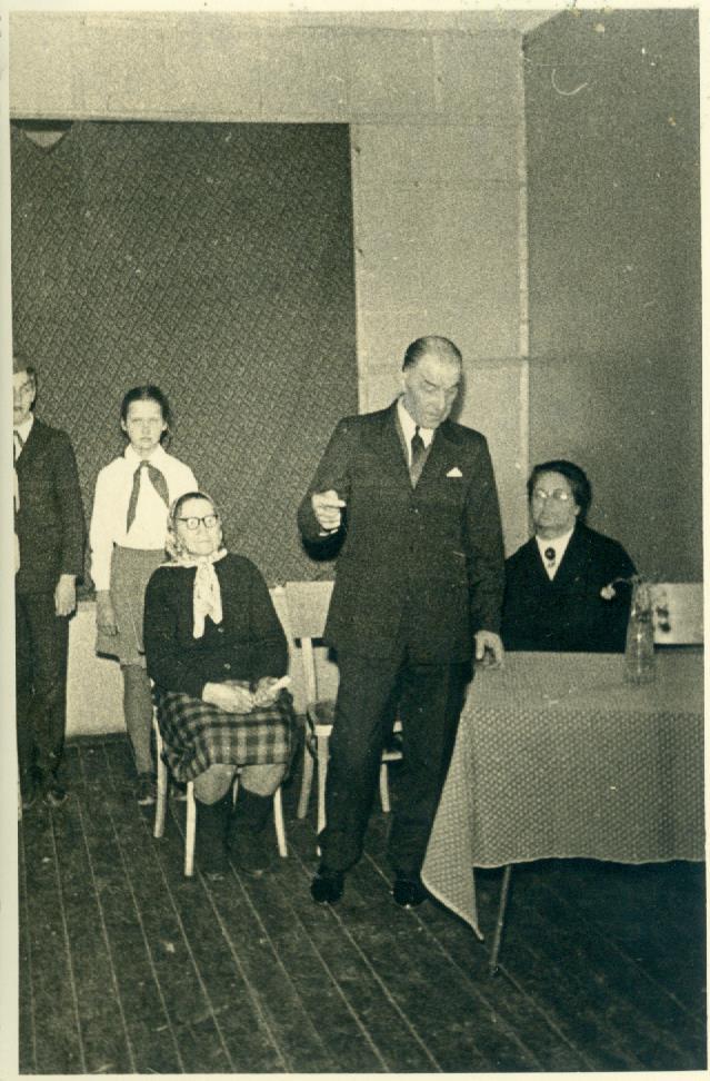 Siltāju astoņgadīgās pamatskolas novadpētnieki G.Eglītes vadībā pēta padomju laika cīnītāju vēsturi. Tikšanās ar bijušā revolucionāra H.Zvejnieka māsu Hortenziju Apini un H.Oša brāli Kārli Ošu. No kreisās puses Hortenzija Apine, Kārlis Ošs un skolas direktore Ausma Bundziņa.