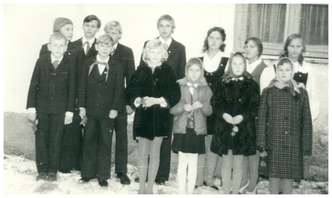 Skolēni, montāžas dalībnieki R.Apīnim un brāļiem - Robertam, Alfrēdam, Augustam, Arnoldam Kauliņiem veltītās piemiņas plāksnes atklāšanā pie Siltāju astoņgadīgās skolas 1975.gada 20.decembrī. Pirmajā rindā no kreisās puses: U.Čunčulis, A.Inda, I.Rinkeviča, M.Andža, S.Kravale, D.Stonka. Otrajā rindā no kreisās puses: K.Birkens, Ā.Lismanis, A.Lietavietis, J.Staradiņš Ā.Ozoliņa, I.Bokoldere, A.Biezā.