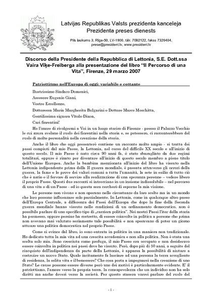 Discorso della Presidente della Repubblica di Lettonia, S.E. Dott.ssa Vaira Vīķe-Freiberga alla presentazione del libro “Il Percorso di una Vita”, Firenze, 29 marzo 2007