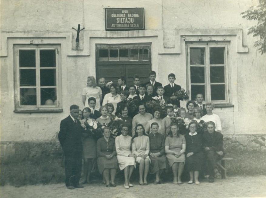 1969./1970.mācību gada absolventi, audzinātāja, skolotāji un vecāki pie skolas. Klases audzinātāja Hilda Lapsa. Absolventi: Pēteris Dāvids, Ludmilla Gabrēna, Andrejs Kaļva, Anita Kaviere, Inese Lietaviete, Modra Logina, Māris Mežulis, Ināra Ozoliņa, Dzintars Sarmulis, Māris Sirmulis, Aivars Smilga, Aivars Ivulāns.