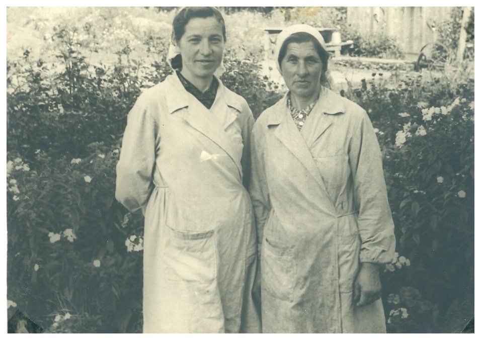 "Mežušuru" lopkopējas, kas ir guvušas labus panākumus piena izslaukāmā. No kreisās puses: Helēna Kaļva, Elza Garā.