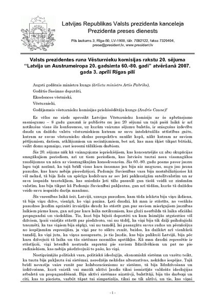 Valsts prezidentes runa Vēsturnieku komisijas rakstu 20. sējuma “Latvija un Austrumeiropa 20. gadsimta 60.-80. gadi” atvēršanā 2007. gada 3. aprīlī Rīgas pilī