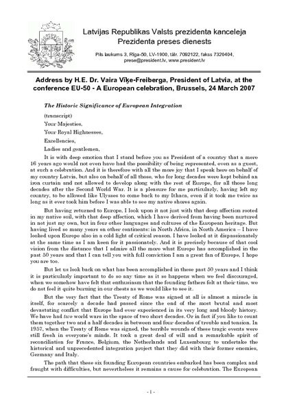 Address by H.E. Dr. Vaira Vīķe-Freiberga, President of Latvia, at the conference EU-50 - A European celebration, Brussels, 24 March 2007