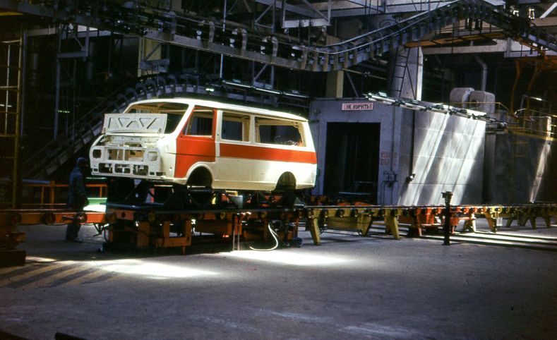 RAF, Virsmas uzklāsmes cehs. Skats uz ceha konveijera līniju.