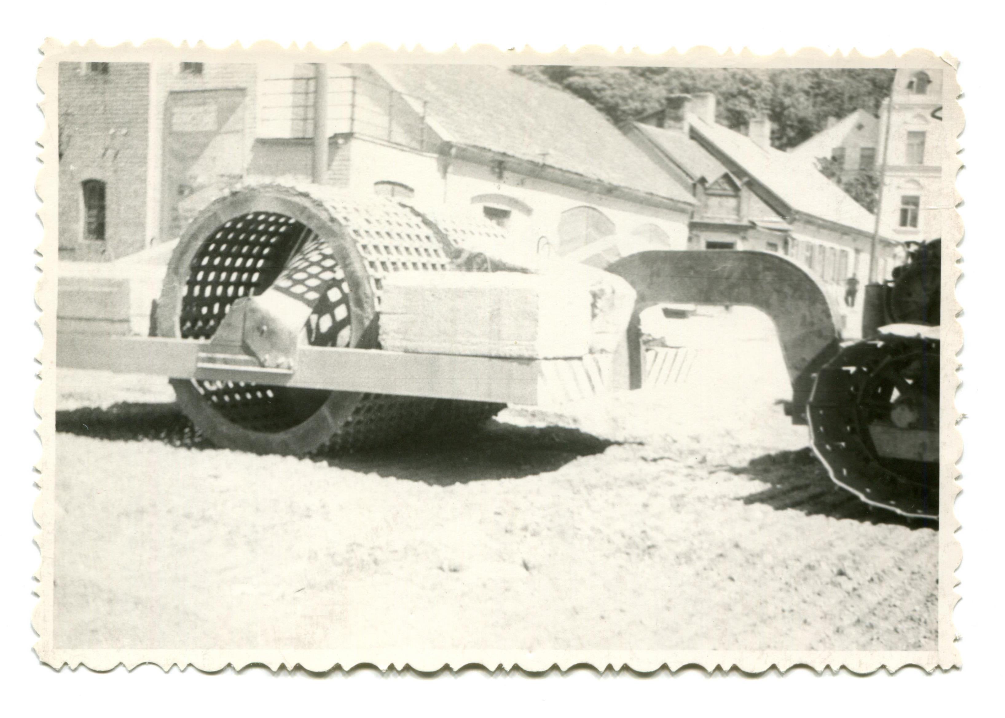 1966. gadā tika pabeigta Ezera ielas rekonstrukcija, labiekārtošana. Tehnika labiekārto Ezeru laukumu. Attēlā traktors T-100 ar piekabinātu ceļa rulli planē segumu. Fonā Talsu brīvprātīgo ugunsdzēsēju biedrības (BUB) depo.