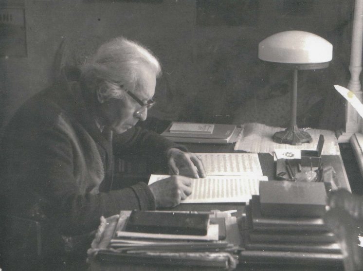 Komponists Arvīds Žilinskis pie darba galda "Lejas Arendzānos" Saukas pagastā 1987.gada maijā