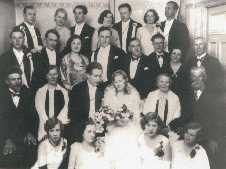 Arvīds un Milda Žilinski savā kāzu dienā 1931.gada 6.jūnijā kopā ar vecākiem un kāzu viesiem