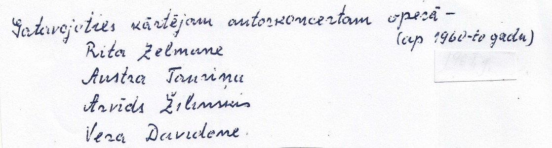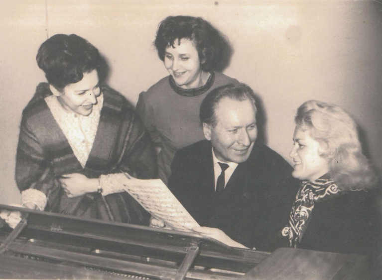 Komponists Arvīds Žilinskis kopā ar operas solistēm, gatavojoties autorkoncertam Latvijas PSR Valsts operas un baleta teātrī 1967.gadā