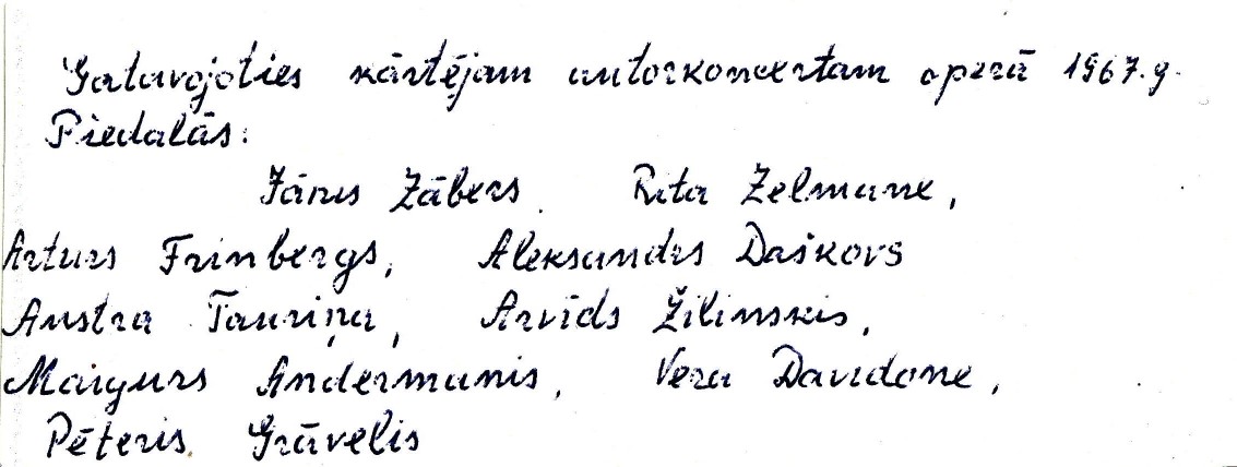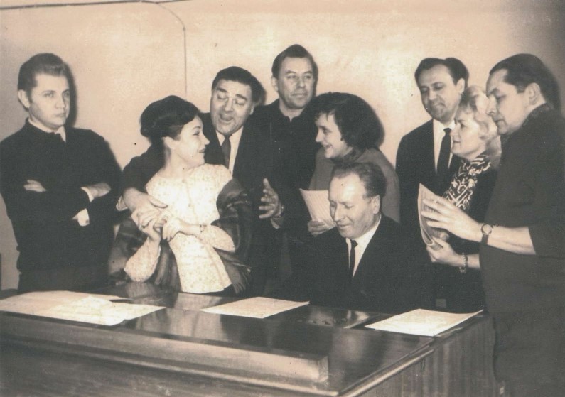 No kreisās: Jānis Zābers, Rita Zelmane, Arturs Frinbergs, Aleksandrs Daškovs, Austra Tauriņa, komponists Arvīds Žilinskis, Maigurs Andermanis, Vera Davidone, Pēteris Grāvelis