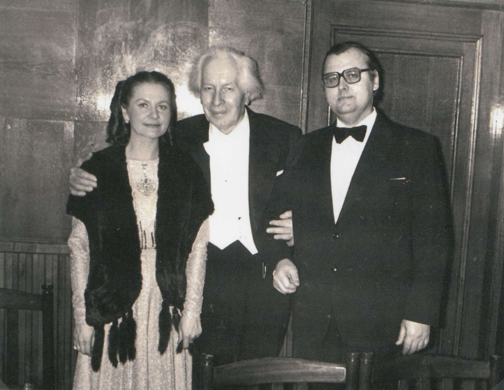Komponists Arvīds Žilinskis ar solistiem Solveigu Raju un Jāni Sproģi pēc autorkoncerta Operā 1986.gada martā