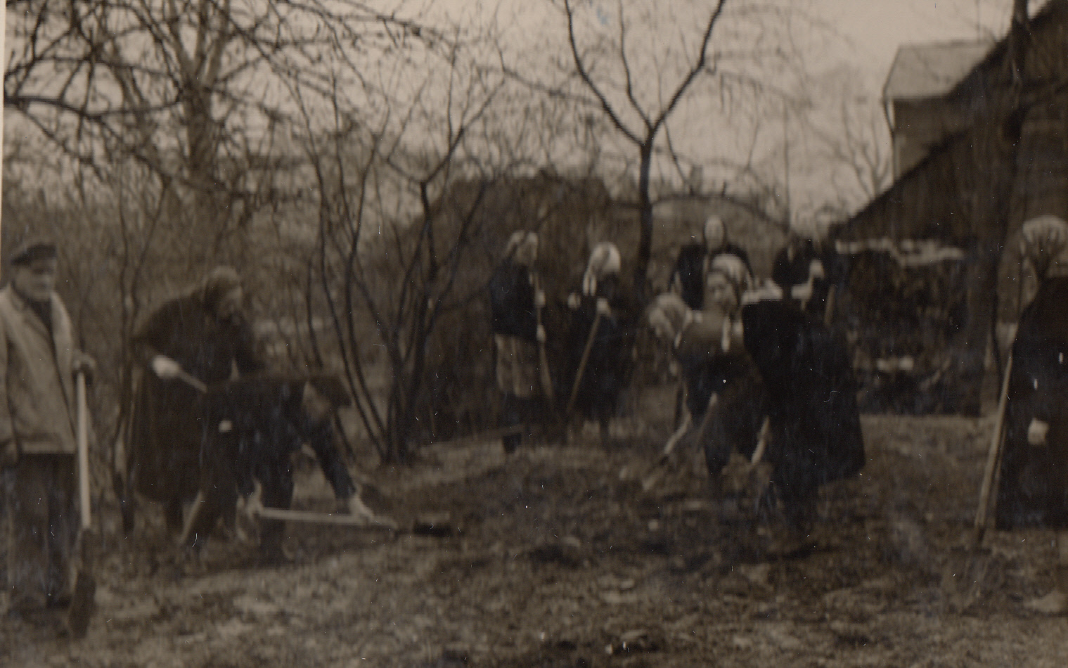 14.puķkopības sekcijas biedri jaunā skvēra ierīkošanas darbos Viesītē komunistiskās sestdienas talkas laikā 1972.gada 14.aprīlī