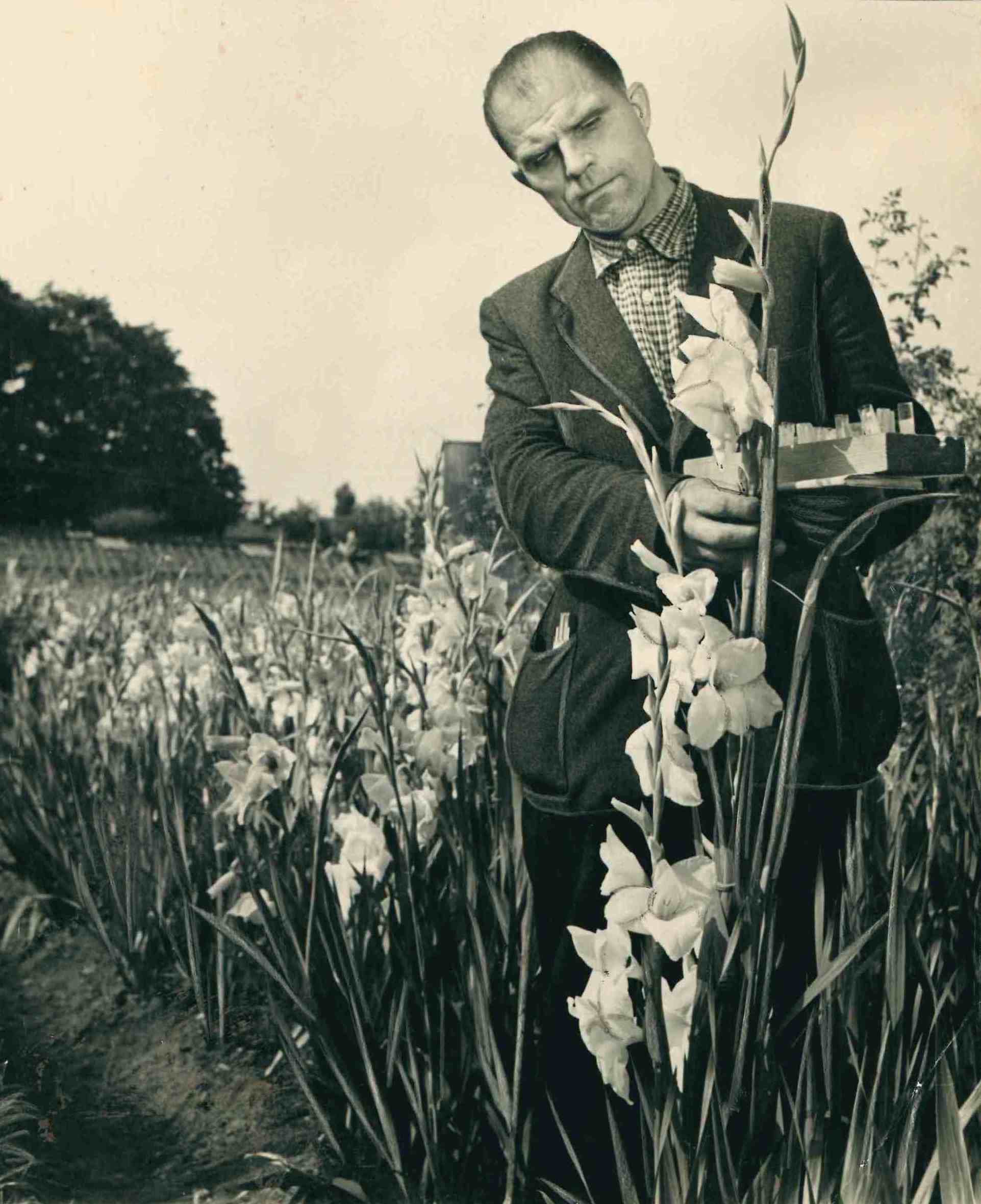 Selekcionārs Viktors Orehovs ar gladiolām Jēkabpils dārzniecībā