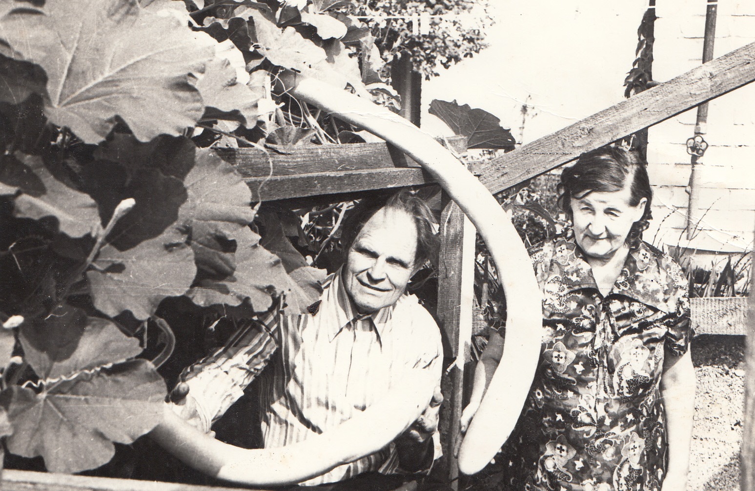 Viktors un Jadviga Orehovi savā dārzā Jēkabpilī ar 1975.gadā izaudzēto Indijas gurķi