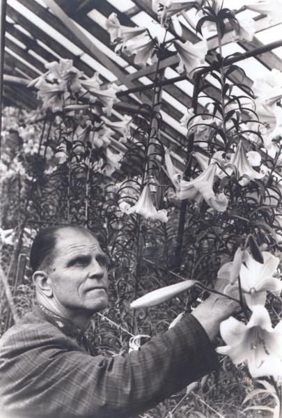 V.Orehovs ar 2-metrīgām lilijām-1969.jpg