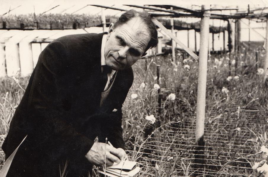 Selekcionārs Viktors Orehovs Jēkabpils dārzniecības siltumnīcā, pārraugot neļķu stādus