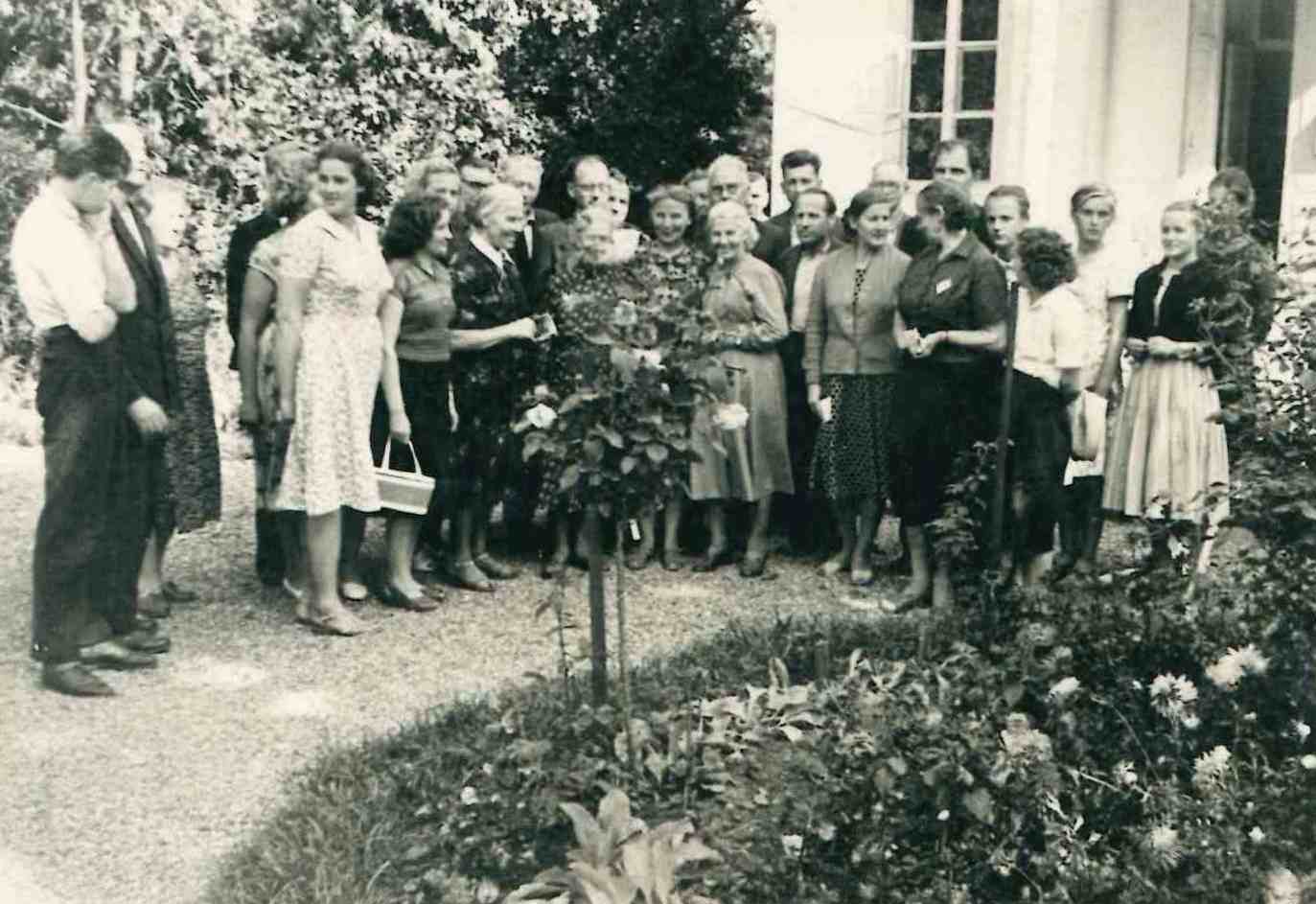 Jēkabpils Dārzkopības un biškopības biedrības pārstāvji pie ievērojamā lietuviešu augļkopības selekcionāra A.Hrebnicka (1857-1941) mājas-muzeja Rojus ciemā (Ignalinas rajons, Lietuva) 1961.gada jūlijā, ceļojot pa Lietuvas PSR dārzniecībām