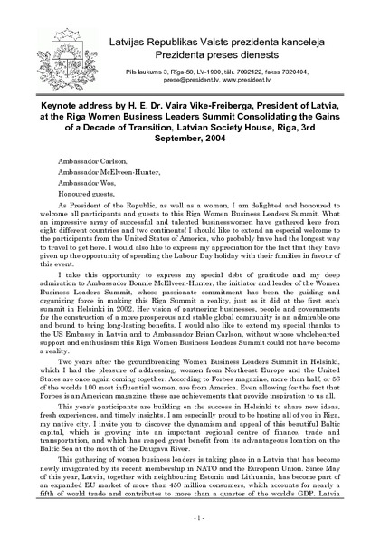 Keynote address by H. E. Dr. Vaira Vike-Freiberga, President of Latvia, at the Riga Women Business Leaders Summit Consolidating the Gains of a Decade of Transition, Latvian Society House, Riga, 3rd September, 2004
