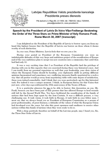 Speech by the President of Latvia Dr.Vaira Vīķe-Freiberga Bestowing the Order of the Three Stars on Prime Minister of Italy Romano Prodi, Rome March 30, 2007 (transcript)