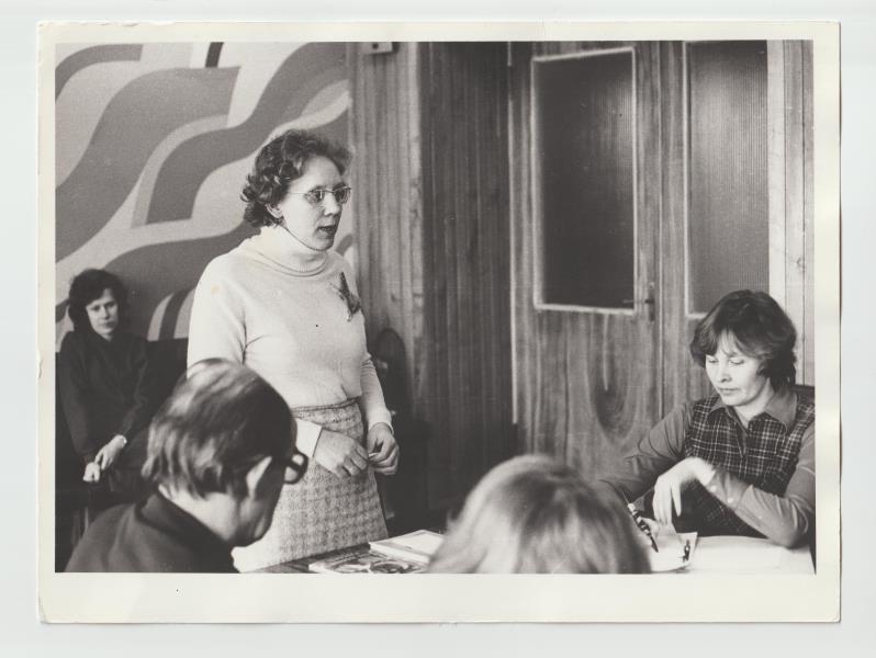 Zvejnieku kolhoza (Z/K) "Banga" pārstāvju un Rakstnieku savienības literātu žūrijas komisijas sēde par Pastariņa prēmijas piešķiršanu 1982. - 1983. gadā publicētajiem darbiem bērnu literatūrā Z/K "Banga" kantora ēkā.