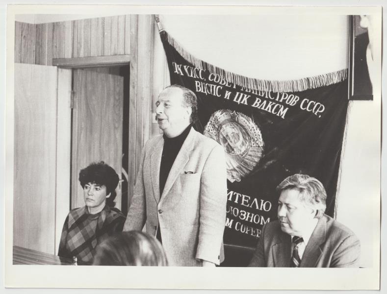 1984. gada 6. aprīlī zvejnieku kolhozā "Banga" notika žūrijas komisijas sēde, kurā izlēma, kam piešķirs "Pastariņa prēmiju" par labākajiem 1982. - 1983. gadā publicētajiem darbiem bērnu literatūrā. No kreisās 1. Z/K "Banga" partijas pirmorganizācijas sekretāre Ināra Samīte, 2. Rakstnieku savienības sekretārs Gunārs Cīrulis, 3. Z/K "Banga" prieksēdētāja vietnieks Gunārs Ozoliņš.