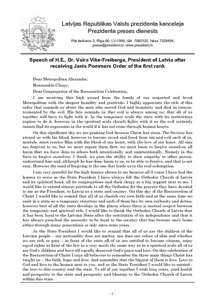 Speech of H.E., Dr. Vaira Vike-Freiberga, President of Latvia after receiving Janis Pommers Order of the first rank