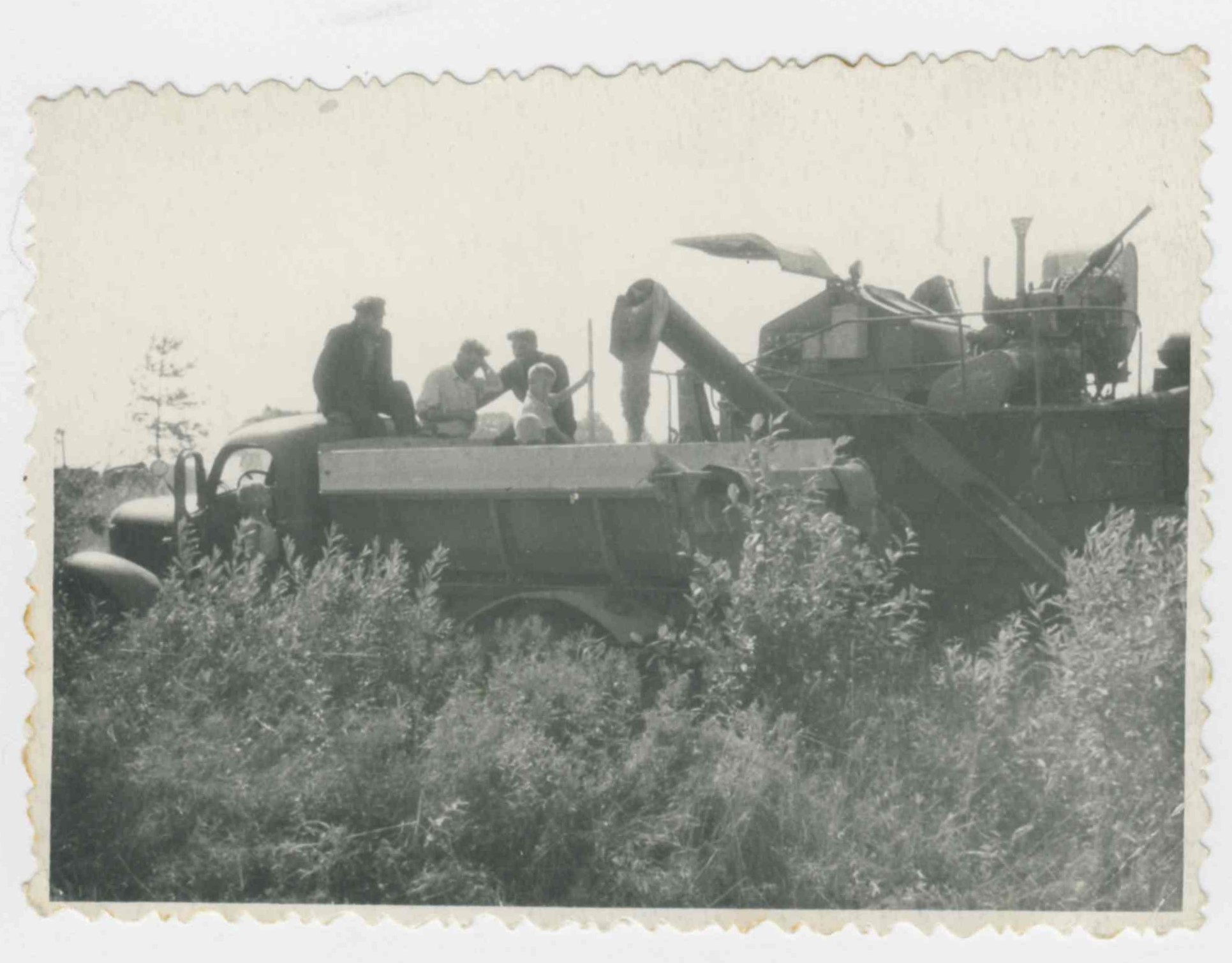 Graudu kulšana kolhozā "Savienība". No kreisās puses: Mārtiņš Gusārs ar dēlu Arni Gusāru.