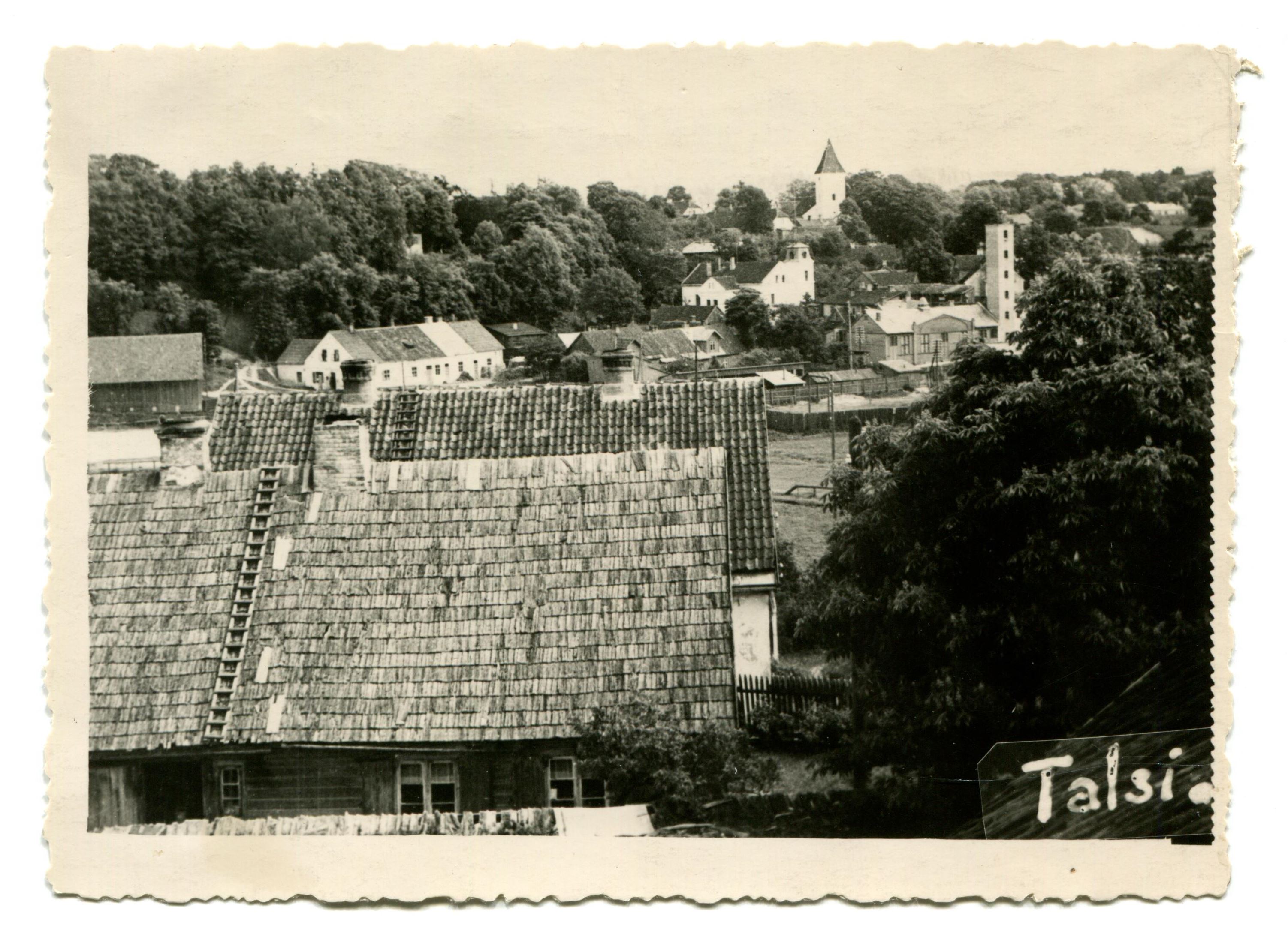Ezera iela, Ezeru laukums, kurā atradās Kolhoza tirgus būdas. Labajā malā Brīvprātīgo ugunsdzēsēju biedrības (BUB) tornis un ēka. Aiz tā redzama pasta ēka Kalna ielā. Tālumā redzams Talsu luterāņu baznīcas tornis. Kreisajā malā Dzirnavkalns, tā pakājē no kreisās melns šķūnis elektrostacijas vajadzībām, sabiedriskā pirts ēka (gaiša ar dažādu krāsu jumta segumu). Priekšpusē dzīvojamā ēka ar koka kārniņu jumtu.