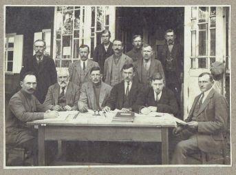 Vēsturiskā lēmuma par Valgales pagastmājas celtniecību pieņemšanas brīdis. Pirmais no labās puses Šetlers Kristaps - valdes priekšsēdētājs no "Gauzēm"; 2. Guļevskis Indriķis - skrīveris; 3. Graudevics Jēkabs no "Mazgriķiem" - valdes loceklis; 4. Aizups Jēkabs no "Aizupēm" - valdes loceklis; 5. "Sniķeru" saimnieks - valdes loceklis; 6. Marcinkēvičš Leons - skrīvera palīgs; 7. Jēgerrmanis no "Mežkalniem" - valdes loceklis; 8. Druvnesis Kārlis no "Kuičiem" - valdes loceklis; 9. Lindemanis Ernests no "Ozoliņiem" - valdes loceklis; 10. Guļevskis Kārlis no "Medniekiem" - valdes loceklis; 11. Gruzītis Kārlis no "Avotiņiem" - valdes loceklis; 12. Šetlers Eduards no "Kalējiem" - valdes loceklis; 13. "Mazsilnieku" saimnieks - valdes loceklis.