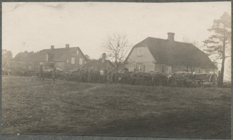 [Strēlnieki un zirgu pajūgi pie lauku mājām]