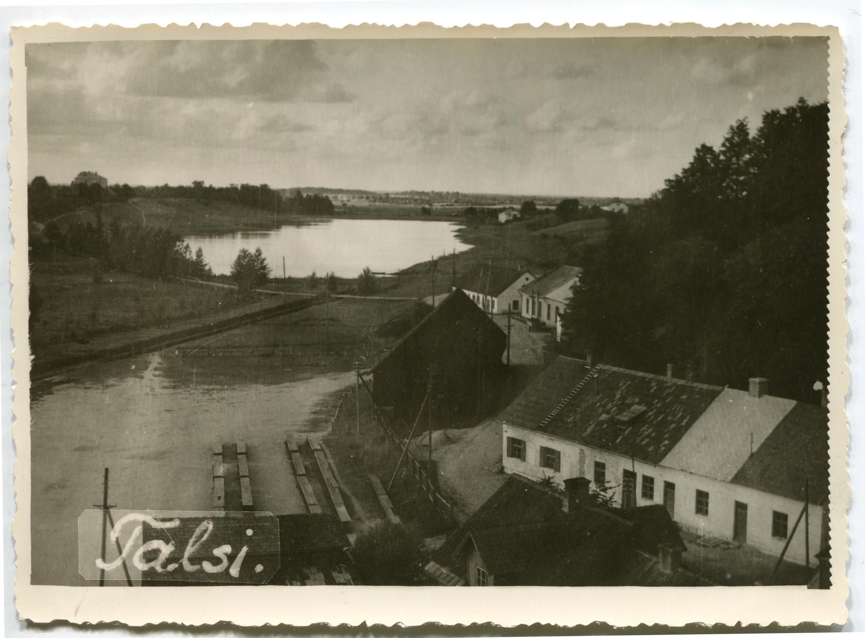 Priekšplānā Talsu tirgus laukums Ezera ielā, tālāk Vilkmuižas ezers, kreisajā malā Krievragkalns. Pirmā ēka pa labi - Talsu pilsētas pirts ēka, uz kuras pamatiem 1970. gadu sākumā uzcelta Talsu rajona patērētāju biedrību savienības pārvaldes ēka ar veikalu; 2. ēka melnā krāsā - šķūnis; 3. ēka (balta ar divkrāsainu jumtu) - pilsētas elektrostacija (spēkstacija); 4. ēka ar tumšu jumtu - Talsu pilsētas lopkautuve.