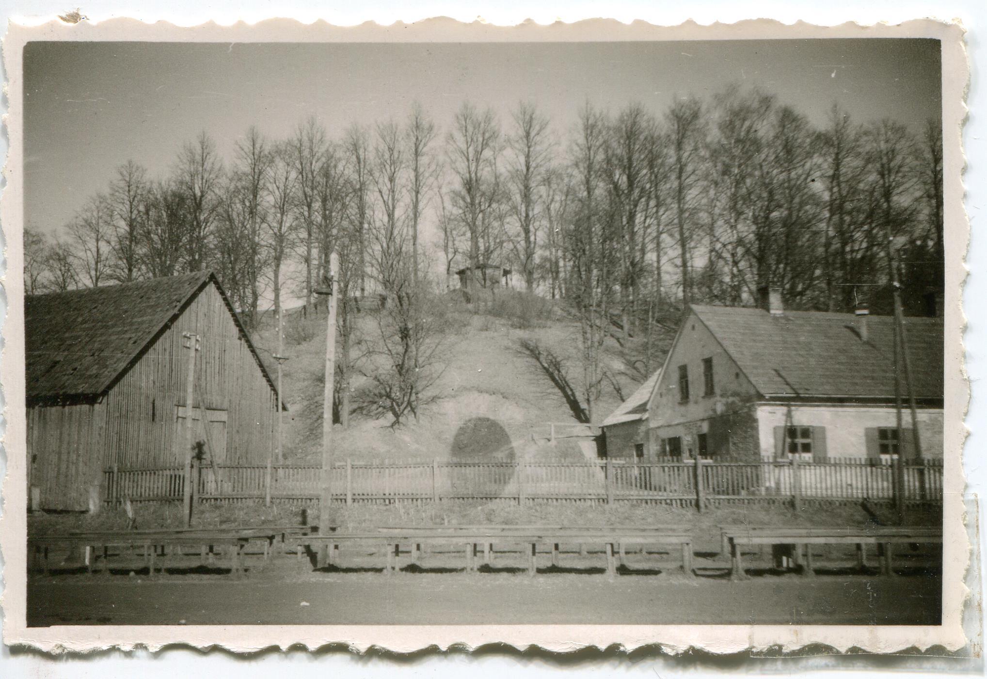 Dzirnavkalna pakājē Talsu pilsētas tirgus laukums Ezera ielā. Labajā pusē pilsētas pirts. Kreisajā malā spēkstacijas malkas šķūnis.