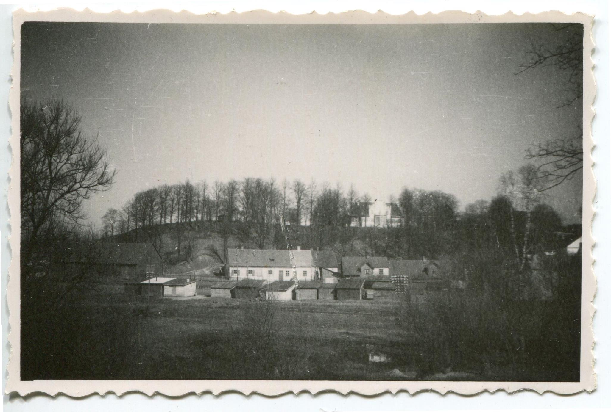 Dzirnavkalna pakājē Talsu pilsētas tirgus laukums un tirdzniecības būdas Ezera ielā. Labajā pusē pilsētas pirts. Kreisajā malā melns spēkstacijas malkas šķūnis.