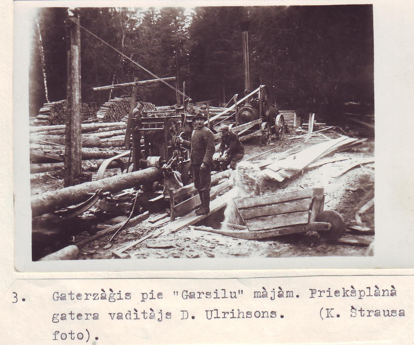 Gaterzāģis pie "Garsilu" mājām, Priekšplānā gatera vadītājs D. Ulrihsons. Ģibuļu pagasts. RĪga - Ventspils ceļš. Netālu no pieturas "Remesi"